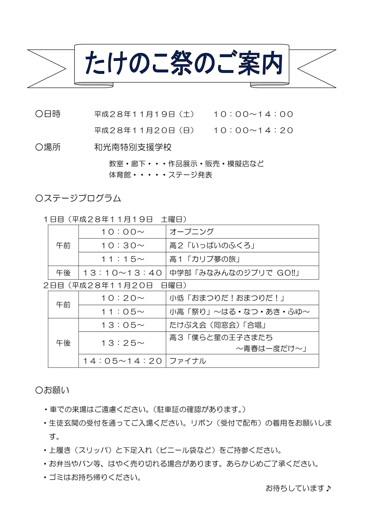 和光市 On Twitter 和光南特別支援学校 たけのこ祭 11月19日 土 20日 日 に和光南特別支援学校にてたけのこ祭が開催されます 生徒の皆さんのステージプログラム 作品展示 模擬店など盛りだくさん 車での来場はご遠慮いただいておりますので 来場の