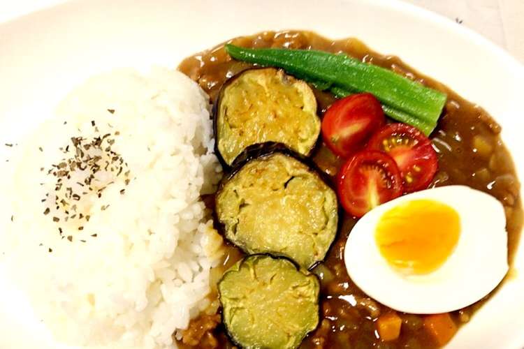 材料 2人分 オクラ 10本 ナス 1本 豚ひき肉 150g ニンニク 1片分 カレールー 40g 水 400ml サラダ油 適量 ご飯 2人分.